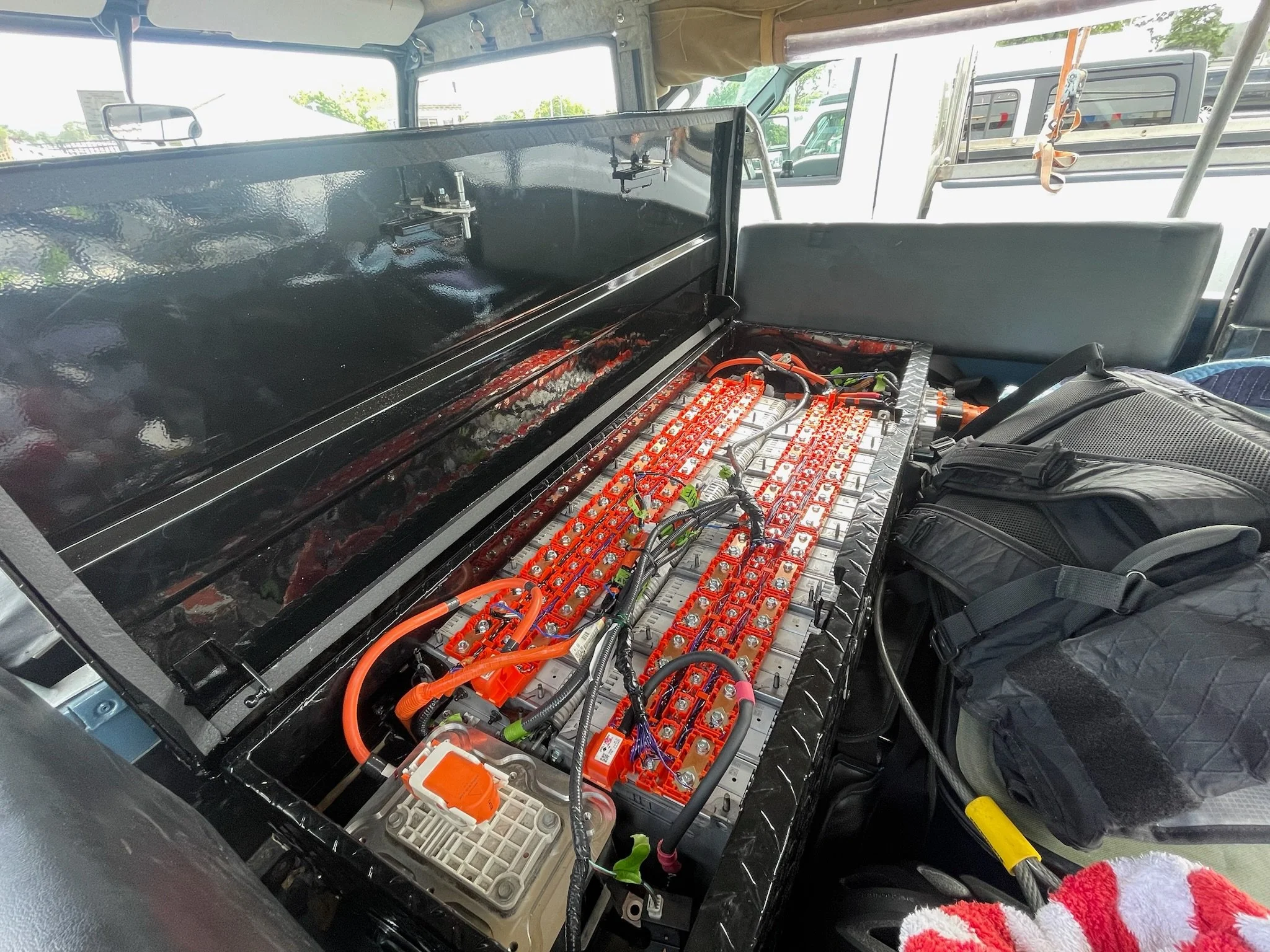 Nissan’s modular, air-cooled/passively-cooled battery was disassembled, rewired and repackaged to temporarily fit in a truck tool box in the bed. HV and LV cables were extended, an after market vehicle control module was wired up as the brains, an ancillary fuse/relay panel was installed and grafted in, and a throttle pedal mount welded up and installed. Lastly, aftermarket gauges with custom 3D-printed housings were used to display my motor RPM, torque, and battery state of charge. Easy in the sense of discussing, but time consuming from an execution standpoint. Lots of staring at wiring diagrams and soldering. Some amount of 3D printing later, radiator mounts were installed along with the stock Leaf radiator, fans and coolant pump. All of the coolant lines were repurposed, and the system was looking pretty sleek. A quick L2 charge and the Land Rover was alive!