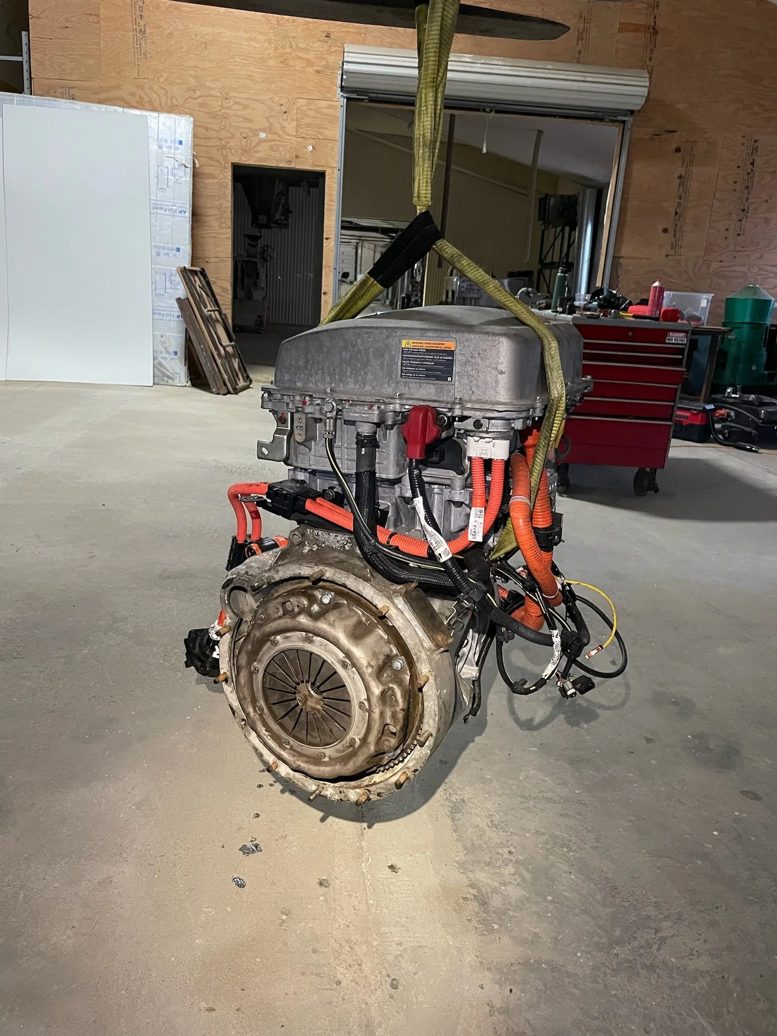 After enduring the joys of an online auction and paying more than I should have, a wrecked Leaf was delivered to my doorstep in the middle of a January snowstorm. It still turned on with the dash resembling a christmas tree, and drove fine with most of the front end of the vehicle missing. I ushered it inside and the disassembly process began. The conversion took ~6 months of weekends and late nights with the help of my girlfriend, Ella. The motor, radiator, gas tank, fuel lines and associated engine gauges were stripped from the Land Rover. I picked up a 3D scanner (technology is wondrous), mapped my empty engine bay, and transferred it into CAD. From the Leaf, I took the motor/inverter/charger stack, charge ports, throttle pedal, battery, coolant pump, coolant reservoir and radiator/associated fans. The motor was also scanned into CAD, and I was able to figure out a mounting solution in the virtual world without making any templates. Long story short, there was a spacer, a plate with an angular contact bearing (to take the axial loads the Nissan EM57 motor wasn’t designed to take), and an adapter that slides onto the Nissan Leaf motor shaft, which replicates a stock Land Rover crankshaft. Ditching the Nissan transmission meant I had to rotate the motor stack up 90 degrees and come up with a new mounting solution from the stock intent. The new front motor mount was devised in CAD, water-jetted in a flat pack of steel bits, and welded up using the stock Land Rover engine mounts and location. The entire assembly fit like a glove, taking up half of the space the old internal combustion engine did.